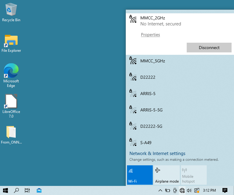 The typical Windows 10 WiFi connection is requested through the small “globe” icon located in the task bar at the bottom of the screen. Networks can be chosen for connection or disconnection as shown here: