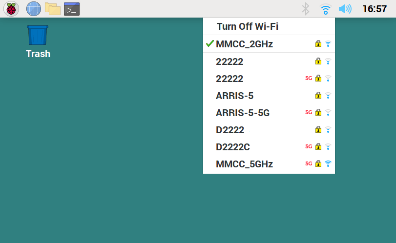 The typical Raspberry Pi connection is requested through the networking icon located in the task bar at the top of the screen. As with Windows, networks can be chosen for connection or disconnection as shown here: