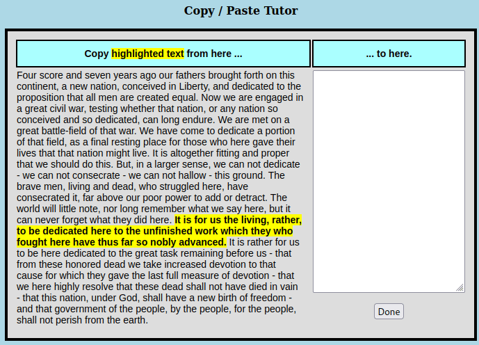 The program will show text on the left (Gettysburg Address) and a blank box on the right. One sentence of the text will be highlighted in bold and yellow. You will need to select that highlighted text (click and drag the mouse), and then copy it to the clipboard and paste it into the white box before clicking the “Done” button. After clicking “Done”, a new sentence will be highlighted if the pasted text matched the yellow highlighted text. If the pasted text didn’t match, then the originally highlighted text will remain highlighted.