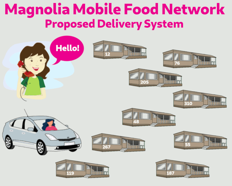 The first step in the proposed system is getting a call that there’s food available for pickup. The second step is finding a driver to pick it up and distribute it. The third step is the driver asking who would like to get a delivery (ideally by text message, but possibly by email). As the delivery requests arrive (by text or email), the driver picks up the food and brings it back to the park. The final step is delivering the food to each resident in the order that the deliveries were requested.
