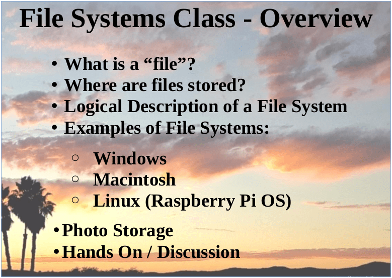 Computer File Systems provide a mechanism to store, find, and modify various kinds of data. These computer file systems are typically presented to users as “folders” that contain both files and other folders. This presentation gives an overview of common concepts in computer file systems.