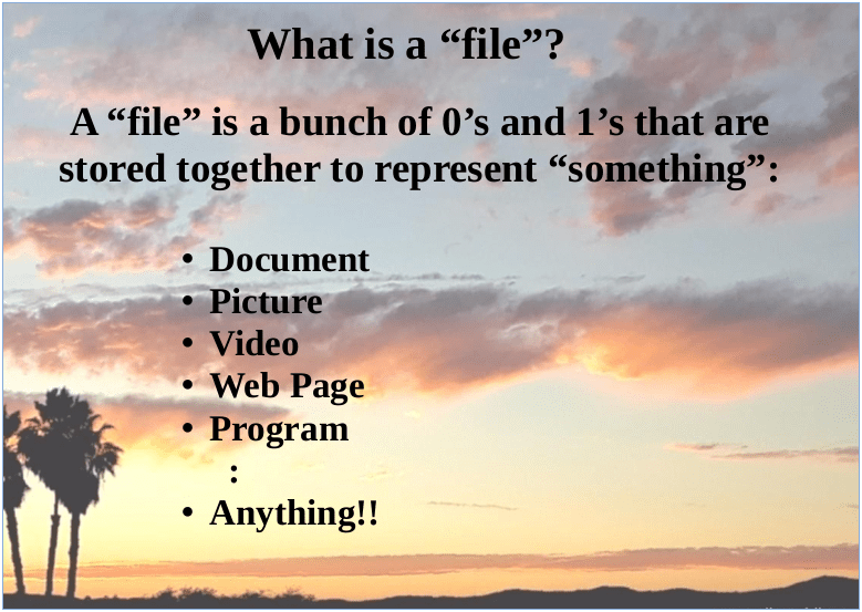 Almost everything that we care about on our computers is stored in what we call a “file”. A “file” is really just an organized collection of 0’s and 1’s that represent something. For example, the upper case letter “M” is stored in a computer as “01001101” (this is the “ASCII” code for “M”), and the upper case “C” is stored as 01000011. So the club’s initials (MMCC) would be stored in the computer as: