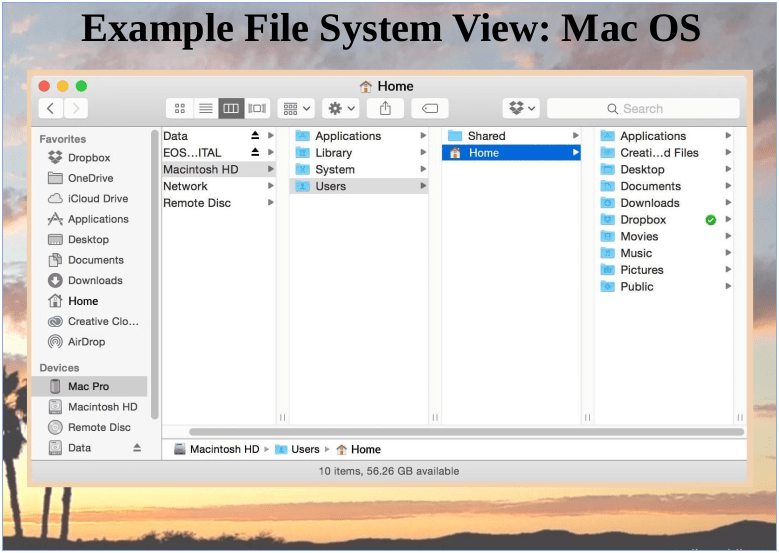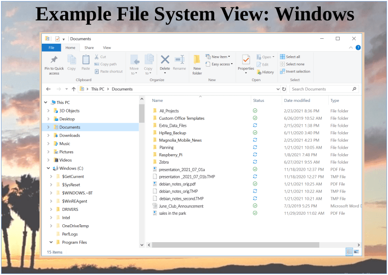 Most modern operating systems have some way of showing you the file system as a picture. They will typically draw a “directory” as a “folder”. And clicking on a directory (folder) will show the files and other folders inside of it. The following 3 pictures show how the file systems are displayed on “Windows”, “Mac OS”, and “Linux”: