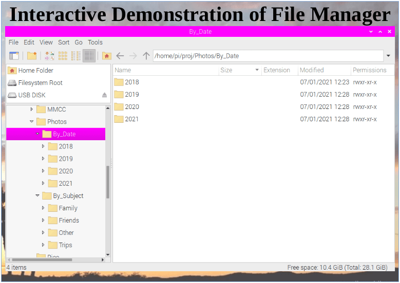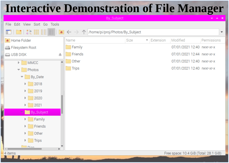 The previous discussion focused on the actual storage abstraction common to all mass storage devices (hard drives, flash drives, SSD drives, etc). However, some programs can work “on top” of the underlying file system. For example, photo organizing software can sometimes provide an abstraction of your files (photos in this case) that does not even resemble the actual storage structure of your drive. These abstractions can often be more convenient to use. For example photos can be organized by grouping them according to their common features (date, size, content, etc). This can be convenient when viewing the photos with that particular software. But it can also make it harder to find those same photos outside of that particular software. So it’s always helpful to know a little bit about the underlying file system.
