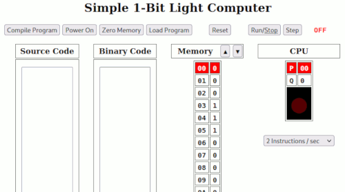 This is a simple 1-bit (0,1) computer with the ability to understand a very simple computer language: “on” and “off”. This computer only understands those 2 instructions: on and off. If the next instruction is “on“, then it will turn the light on. If the next instruction is “off“, then it will turn the light off. This computer is so simple that it’s easy to write programs in binary with 1‘s and 0‘s. But it also supports writing and compiling “source code” made up of “on” and “off” instructions. The source code is written in the “Source Code” block. The “Compile Program” button will translate it into binary instructions into the “Binary Code” block. From there it can be easily loaded into memory (with the “Load Program” button) and run (with the “Run/Stop” button) just as if it had been originally written in binary.