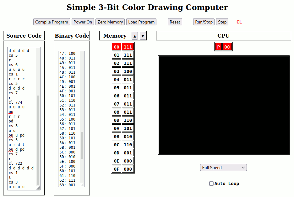 To run the simulation, enter a short program in the “Source Code” box on the left. Try the program “cs 4 u r d l” which will draw a small red square (“cs 4” selects red, and “u r d l” draws the square by moving up, right, down, and left). Then click the “Compile Program” button. This will translate (compile) your source code into binary code in the “Binary Code” box. Then click the “Load Program” button to copy the program into Memory. Finally, click the “Run/Stop” button (upper right) to make the computer actually run the program from Memory. It should draw a small red square in the center of the screen. It will normally stop when done (unless the “Auto Loop” box is checked). You can run it again with the “Run/Stop” button or step through the program one instruction at a time with the “Step” button. Remember that the simulation will highlight the NEXT instruction to be executed.